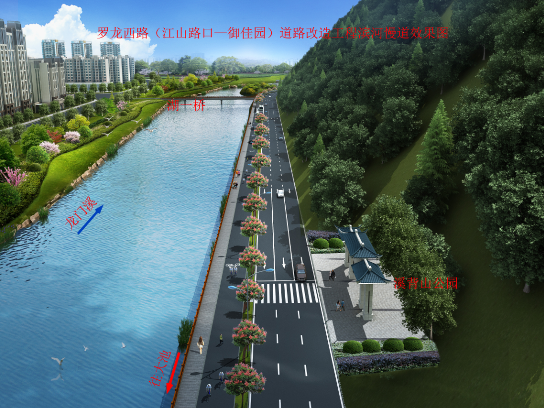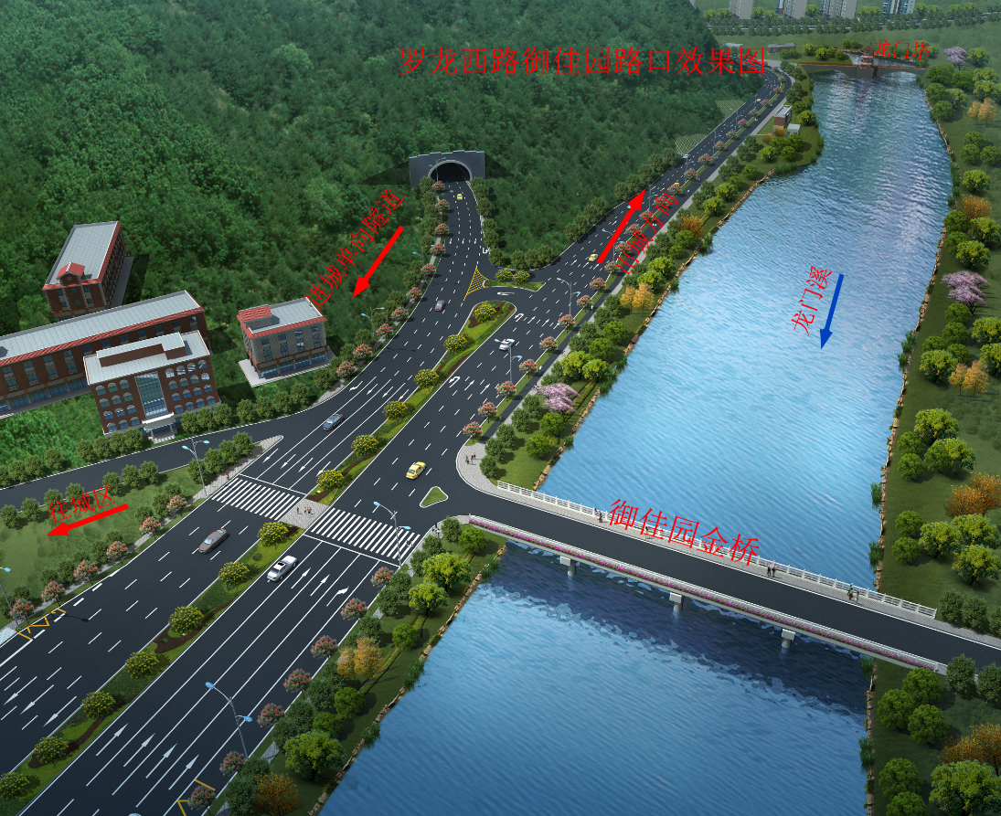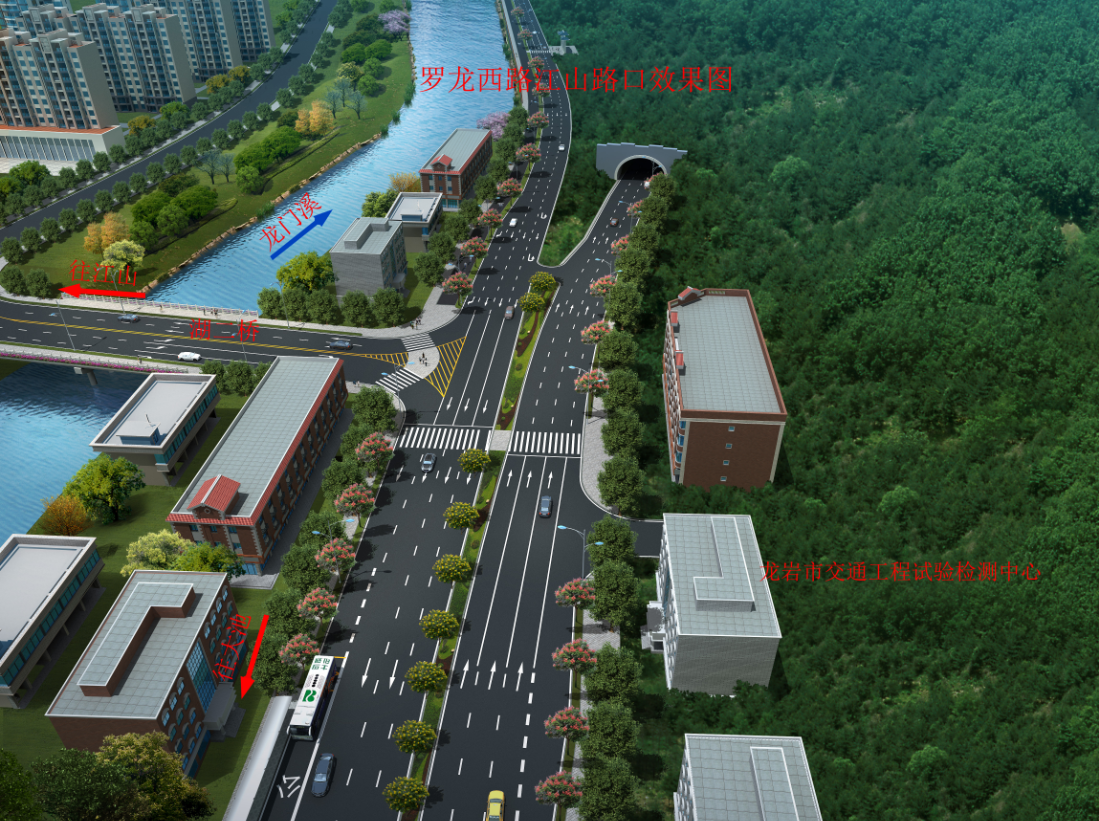 羅龍西路是連接龍巖西高速出入口與中心城市的唯一通道,其規劃改造范圍從紅竹山橋至御佳園路口,全長(cháng)3855米,計劃將原道路拓寬至40米,實(shí)行雙向六車(chē)道,兩旁設2.5米非機動(dòng)車(chē)道,并在湖二橋路口以東設640米入城單向三車(chē)道隧道連接至御佳園路口,原羅龍西路湖二橋至御佳園段將調整為出城單向車(chē)道。